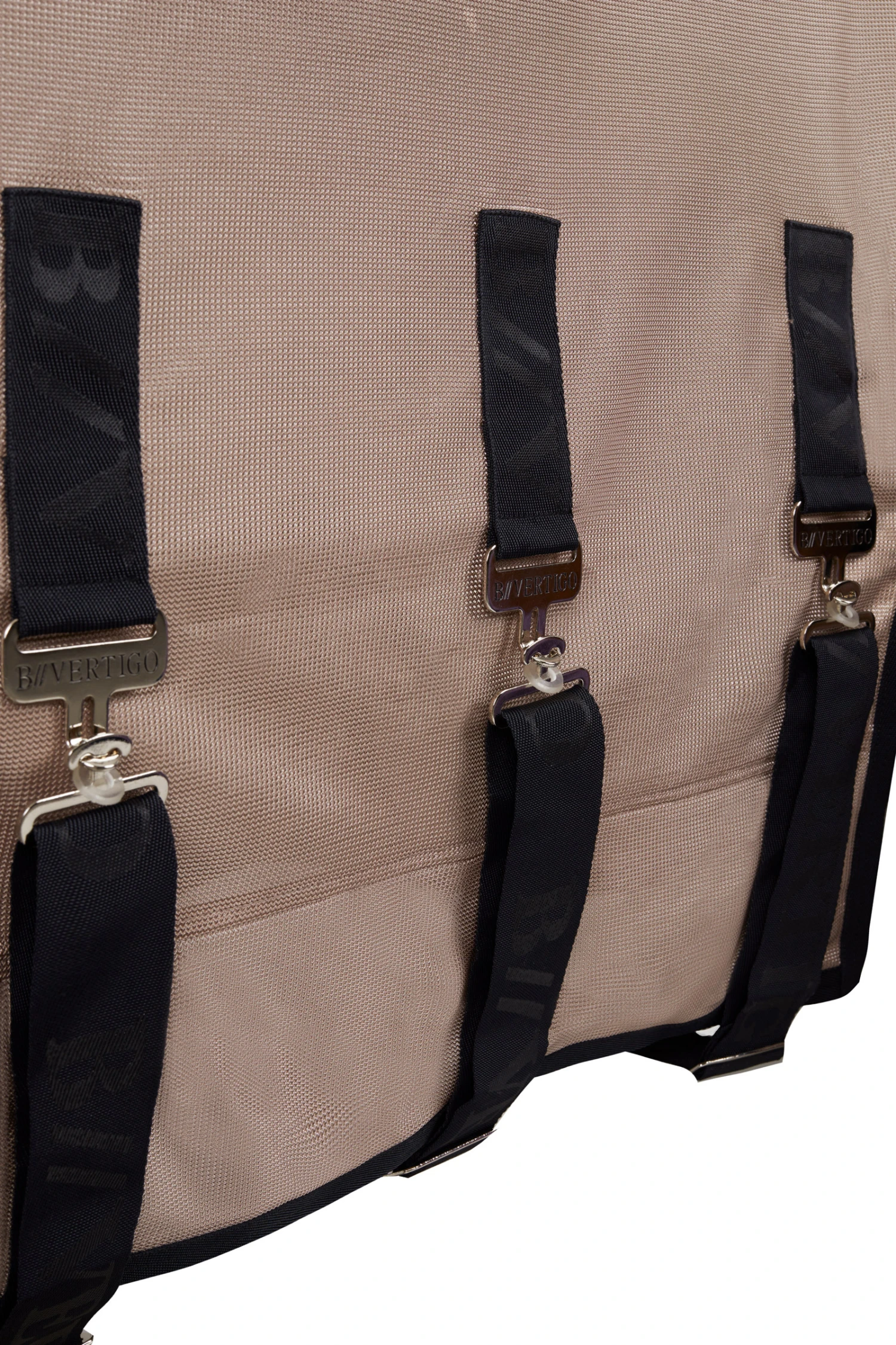 Die B Vertigo Delux Fliegendecke wird mit einem abnehmbaren Halsteil geliefert und bietet UV-Schutz und hält lästige Insekten fern. Der große Schweiflatz und der Bauchlatz bieten maximale Deckung und machen die Decke auch für empfindliche Pferde geeignet. Das Halsteil lässt sich mit Schlaufen und Klettverschluss an der Decke befestigen, ebenso wie das Halsteil geschlossen werden kann. Um Scheuerstellen zu vermeiden, sind Brust-, Schulter-, Mähnen- und Schweifbereich glatt gefüttert. Elegante Logo-Jaquardtape-Details sorgen für einen schlichten Blickfang, der den funktionalen Stil abrundet. 2 klassische Frontverschlüsse, 3 verstellbare, gerade Bauchgurte, Beinschnüre und ein Schweifriemen halten die Fliegendecke sicher an ihrem Platz.