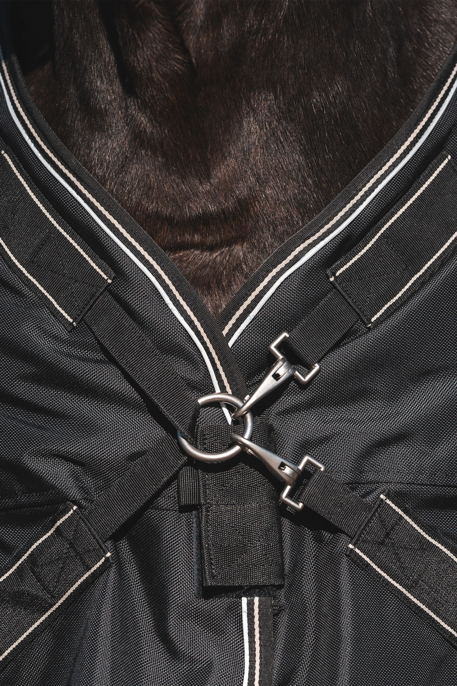 Obsidian ist eine äuĂźerst elegante, multifunktionale Weidedecke mit passendem Halsteil. Die anatomische Passform und die weiche Schaumstoffpolsterung oben auf dem Widerrist heben die Decke leicht an, um den Druck zu mindern und den Komfort zu erhöhen. Die Decke gibt es in drei verschiedenen AusfĂĽhrungen: die Basisversion ohne FĂĽllung, eine etwas dickere Version mit 150 g FĂĽllung (#345231) und eine warme Version mit 300 g FĂĽllung (#345232), die den Anforderungen kalter Winterbedingungen gerecht wird. Sowohl Decke als auch Halsteil bestehen aus einer atmungsaktiven, wasserabweisenden AuĂźenschicht (5000mm-3000gsm) und einer Innenschicht aus gewebtem Welltex®-Gewebe, die dem Fell des Pferdes am nächsten ist. Die glatte Oberfläche des Futters schĂĽtzt das Fell vor Scheuerstellen, und der Stoff reflektiert die Infrarotenergie intensiv und stark. Durch die groĂźe Größe der Decke kann Welltex® seine therapeutische Wirkung auf eine groĂźe Fläche des Pferdekörpers ausĂĽben. Obsidian hĂĽllt das Pferd in eine weiche Umarmung, die dazu beitragen kann, die Durchblutung aller groĂźen, wichtigen Muskelgruppen anzuregen – was sie zu einer hervorragenden Wahl vor und nach jeder Aktivität sowie während der Ruhe- und Erholungsphase macht. Die Decke wird durch doppelte Brustschnallen, gekreuzte Gurte und eine kunststoffummantelte Schweifkordel mit D-Ringen an ihrem Platz gehalten. Das Design ermöglicht eine einfache und stabile Befestigung an Back on Track-Linern.