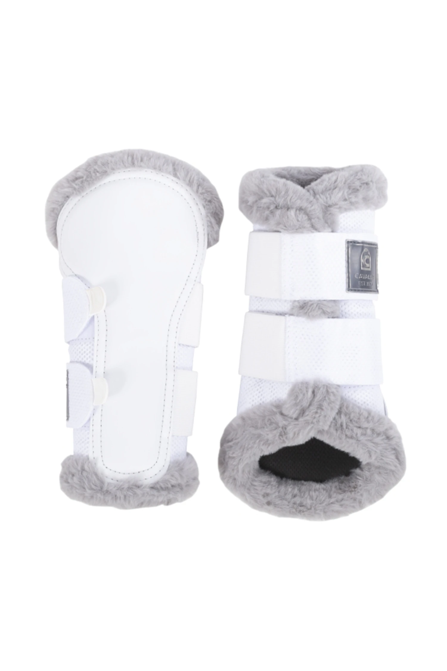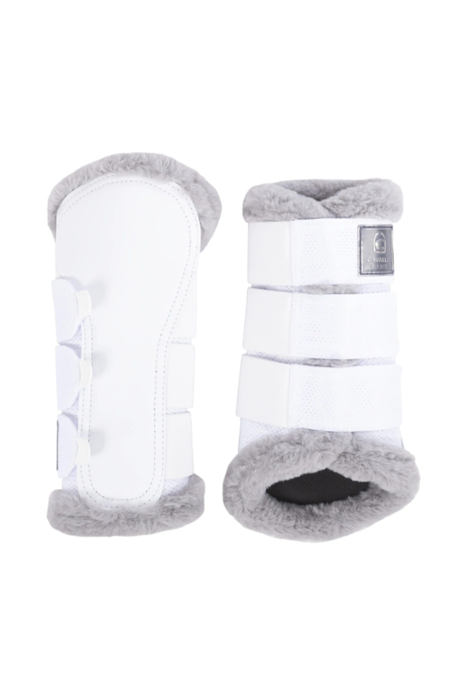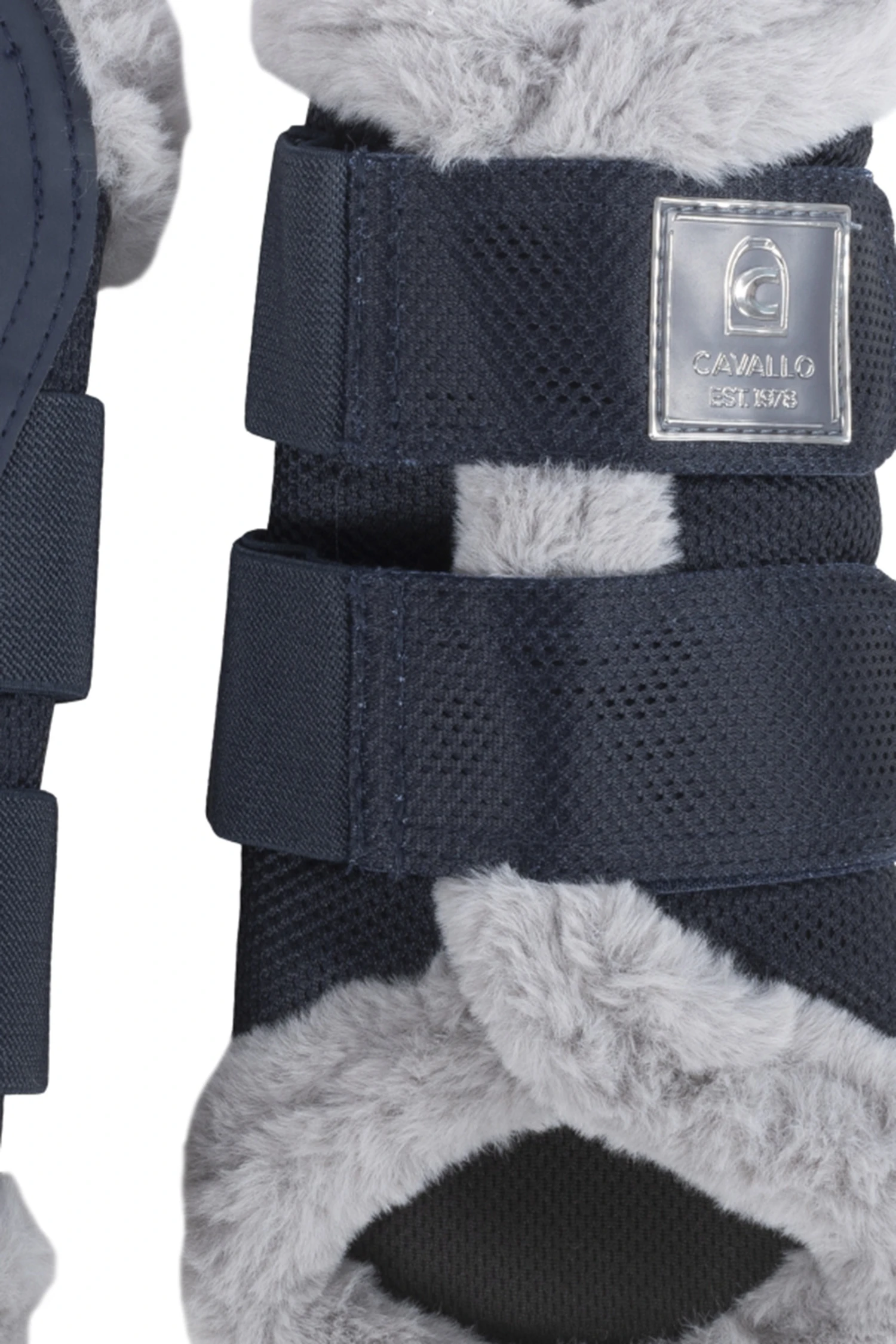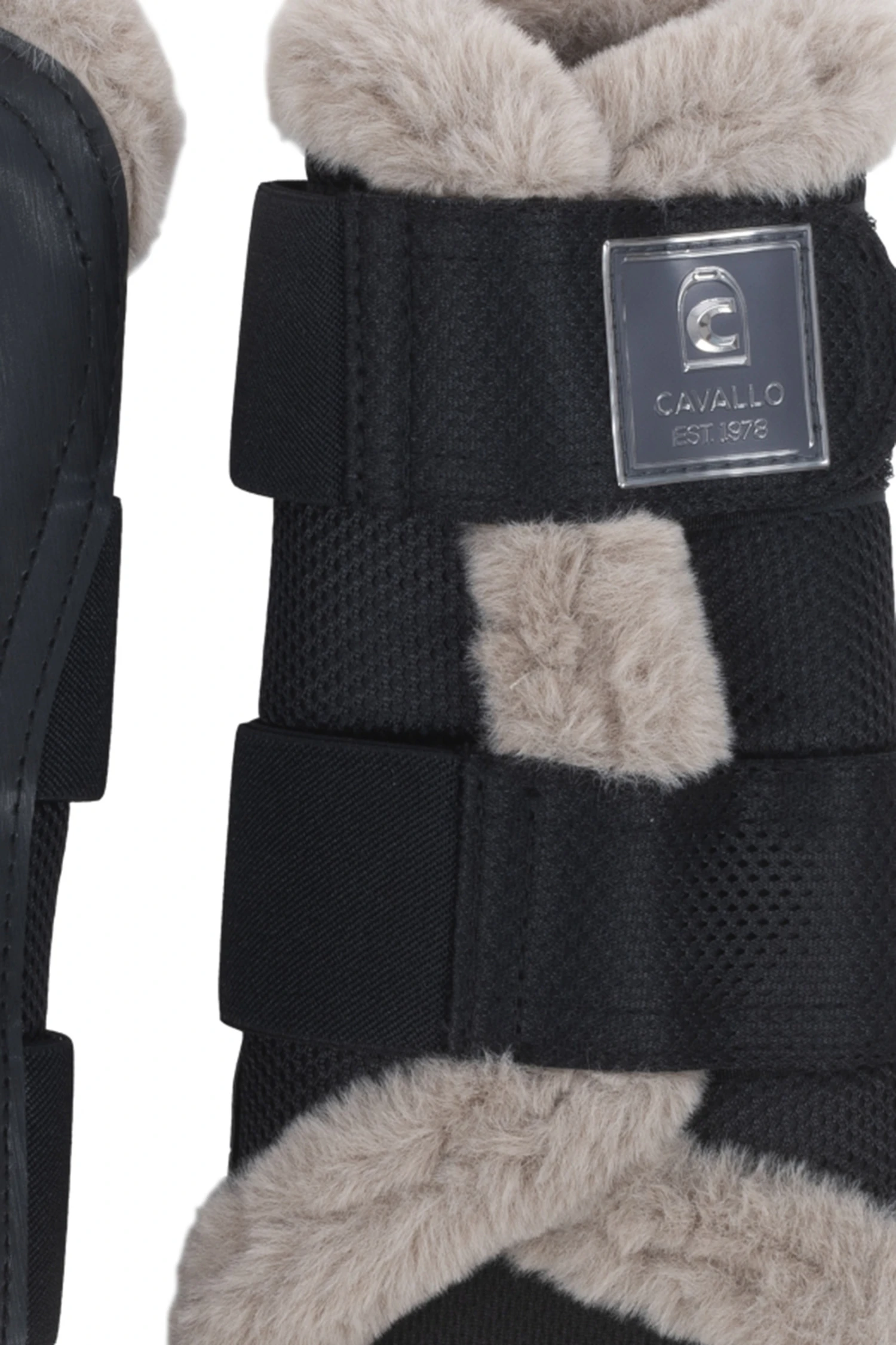 Hochwertige Gamaschen aus Mesh und Kunstleder. Die Innenseite der Gamasche ist mit atmungsaktivem Mesh gefüttert.Die Fake-Fur Einfassung sorgt nicht nur für eine tolle Optik, sondern auch für einen hohen Tragekomfort.Die Gamaschen sind mit zwei, bzw. drei breiten Gummibändern und Flauschband zum Verschließen an derAußenseite versehen.Das Klettband ist mit einem Cavallo Label geschmückt