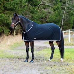 Gut passende, leichtgewichtige Sommerdecke, hergestellt aus atmungsaktivem Pritex Gewebe. Exzellente Decke für den Transport oder im Stall. Die Decke hat modische Streifen, handliche Karabinerhaken am Brustverschluss, einen Bauchgurt und Beinschnüre. Exzellente Wahl für eine Bestickung mit dem Pferde- oder Stallnamen!
