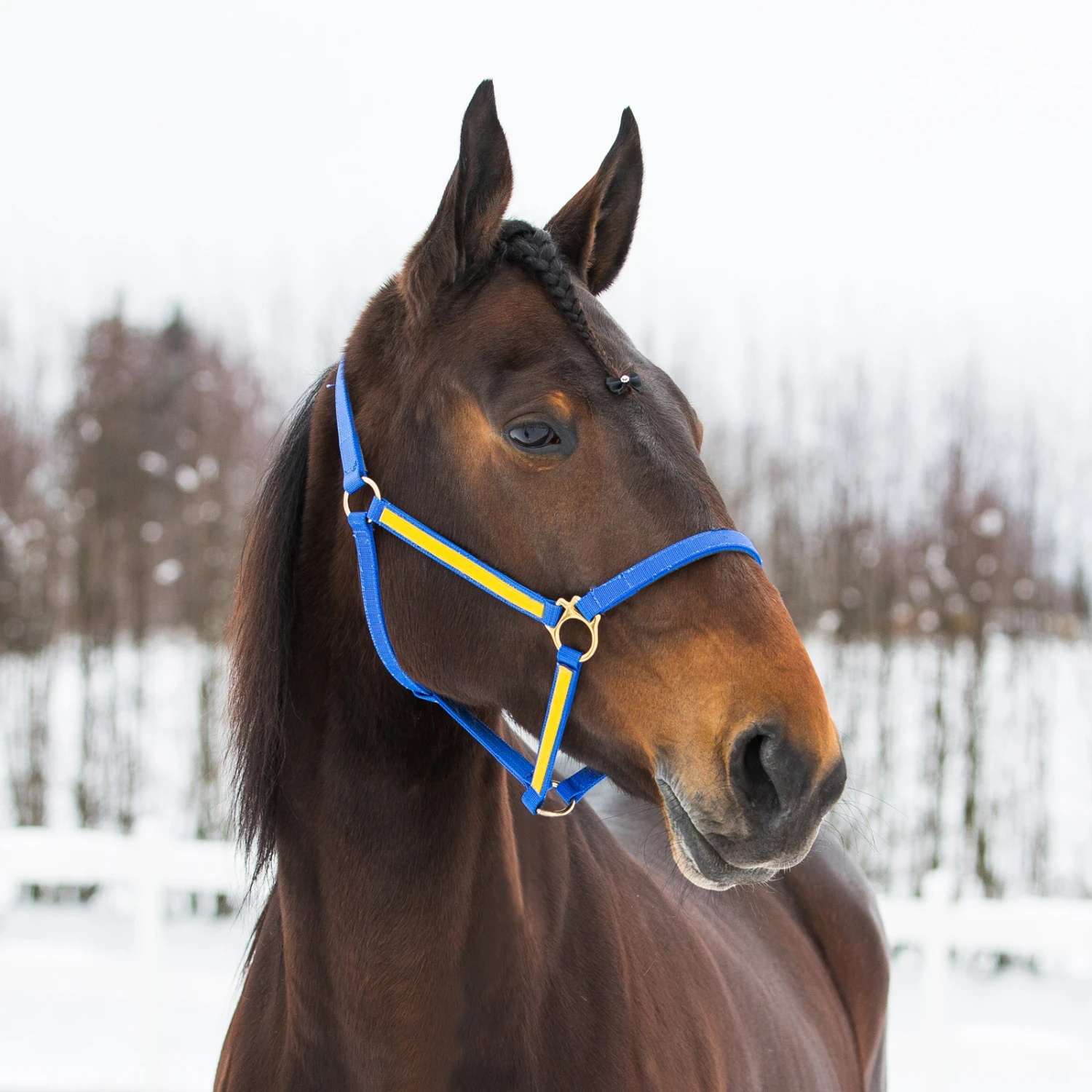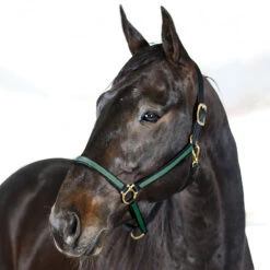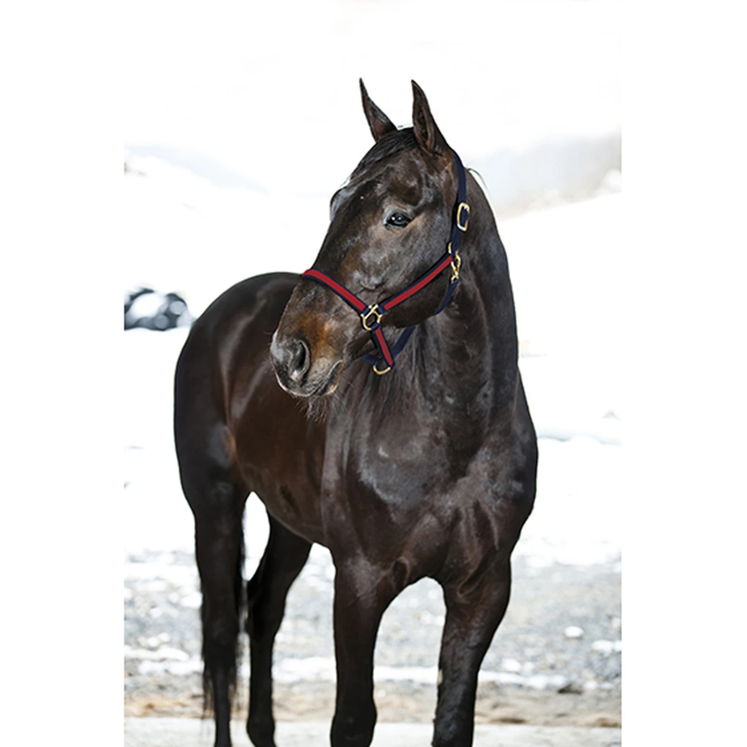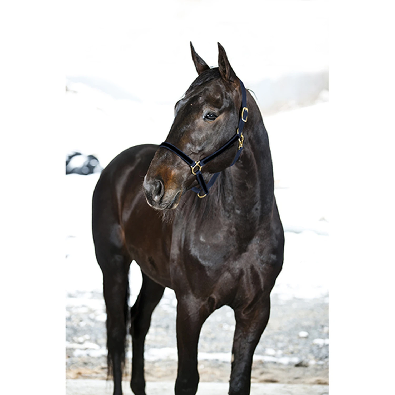 Finn-Tack Nylon Yankee Halfter, aus weich gepolstertem, 20mm starken Nylon gefertigt. Solide Messing-Beschläge und synthetisches Leder-Polster am Genick.