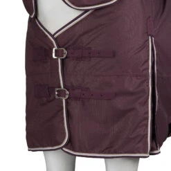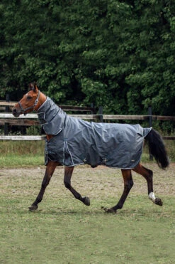 Diese Decke mit Halsteil ist aus wasserdichtem, atmungsaktivem Material gefertigt. Der gute Sitz an Hals und Schultern macht sie bequem und die hohen Gehfalten bieten Bewegungsfreiheit, damit sich dein Pferd austoben kann und nicht eingeschränkt wird. Frontverschlüsse, Kreuzgurte und Beinschnüre halten die Decke sicher an ihrem Platz und verhindern Verrutschen.