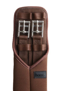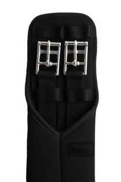 Weicher Neopren-Dressurgurt ohne Gummizug. Für mehr Komfort reicht das Neopren weit über die Rollschnallen hinaus, um Scheuer- und Druckstellen zu vermeiden. Gurtschlaufen halten die Gurtstrupfen an ihrem Platz. Logoplakette aus Gummi.