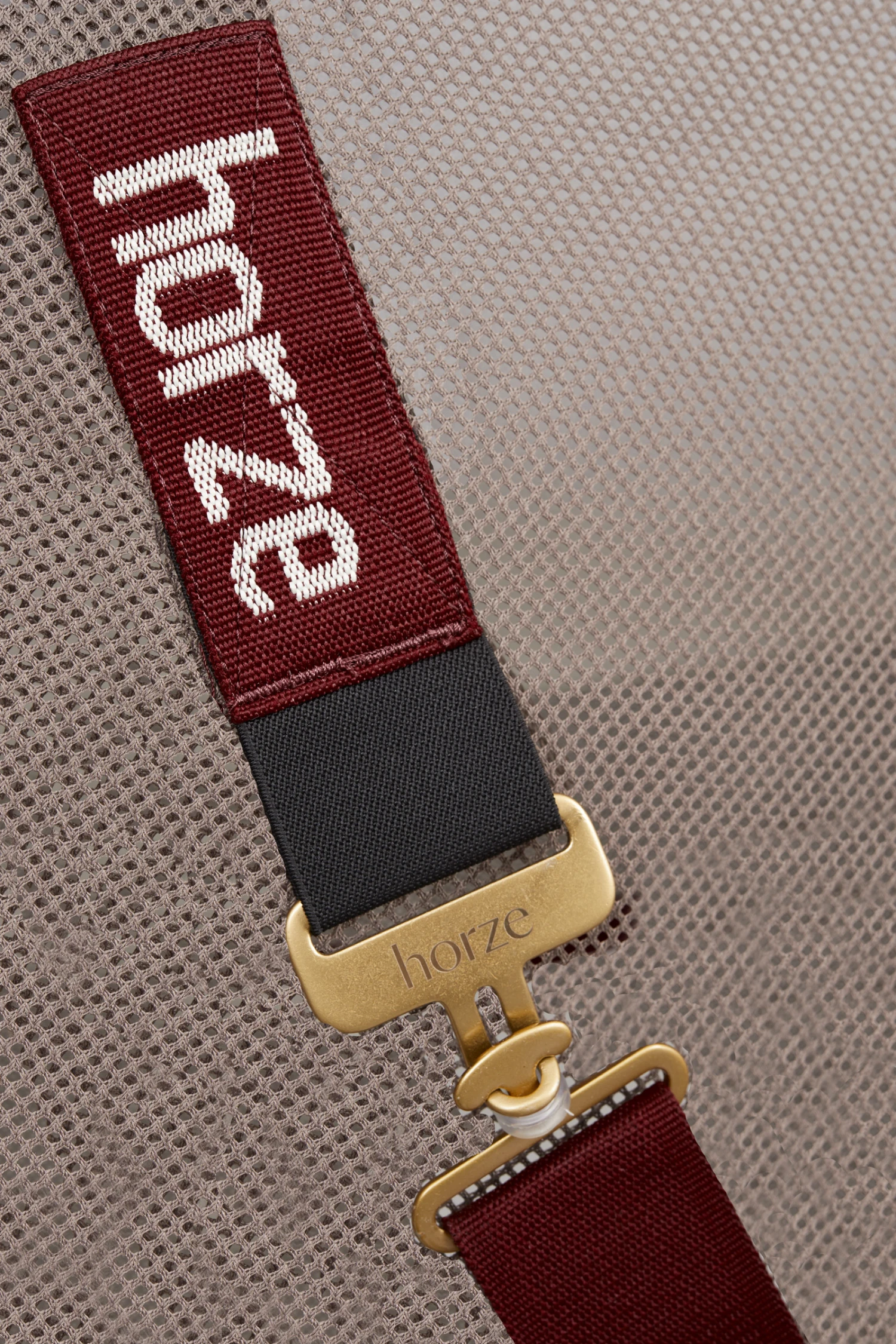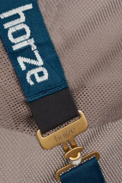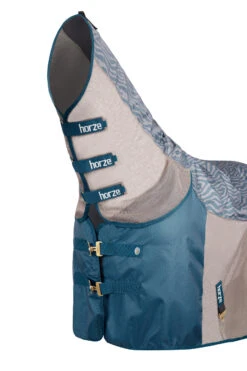 Unsere Horze Kenya Weidedecke ist an der Oberseite wasserdicht und an den Seiten atmungsaktiv. Sie hält dein Pferd trocken und bequem. Das einzigartige Muster sieht umwerfend aus. Das glatte Innenfutter an den Schultern verhindert Reibung. Das Halsteil lässt sich einfach mit D-Ringen befestigen und schließt sicher. Zwei vordere Schnallen, Kreuzgurte und Beingurte halten die Decke an ihrem Platz. Kombiniere diese Decke mit dem Rest unseres Horze Kenya Sortiments für einen kompletten Look!