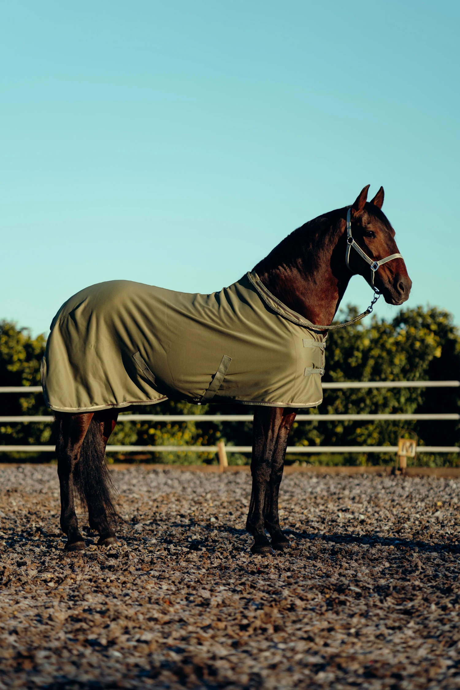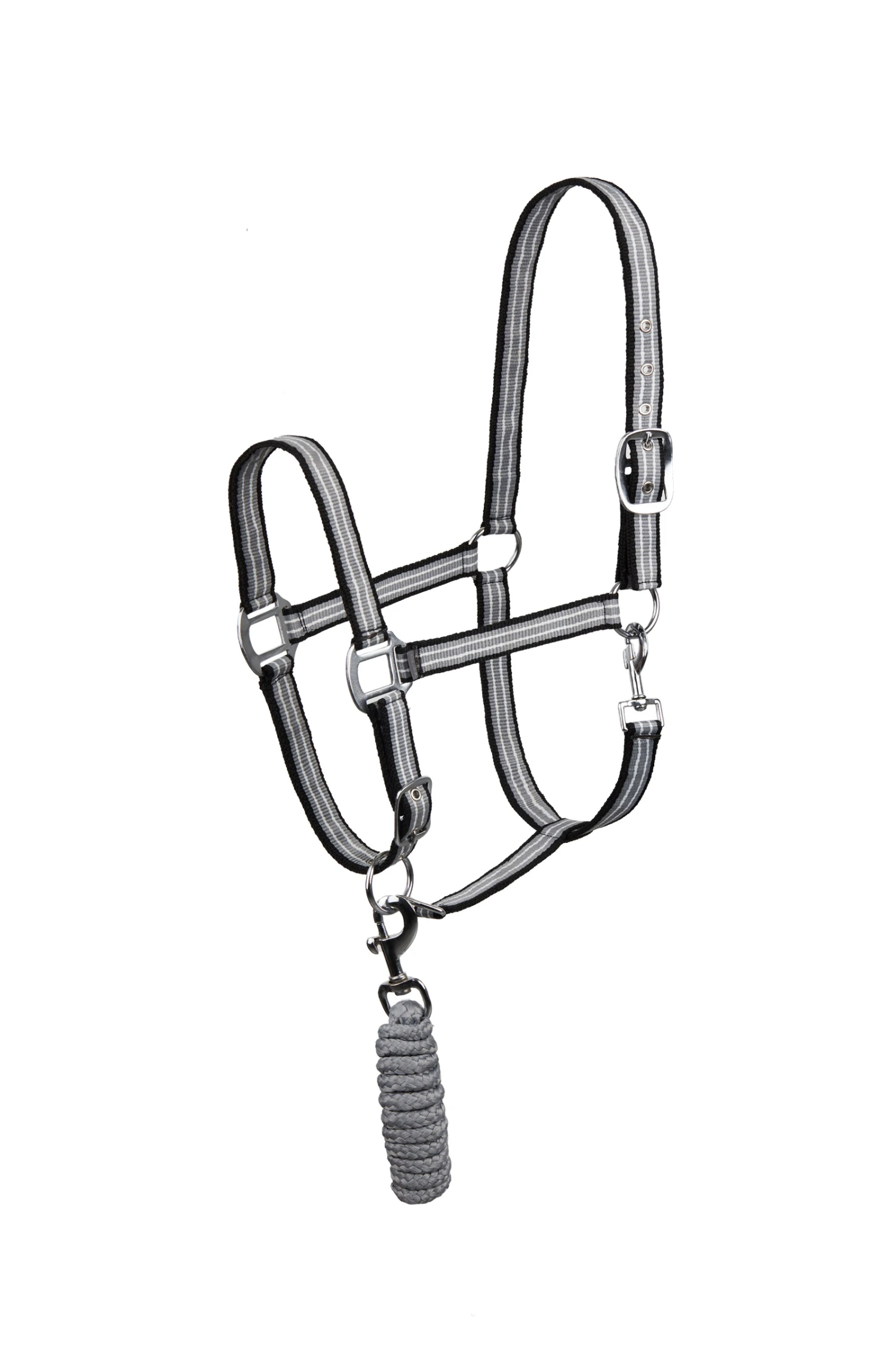 Unser Horze Munich Halfter und Führstrick Set besteht aus einem gestreiften Halfter mit verstellbaren Schnallen an Genick und Nase und einem einfarbigen Führstrick aus geflochtenem Seil in sanften Farben. Starke Karabinerhaken schließen sicher. Silberne Beschläge vervollständigen den Look.