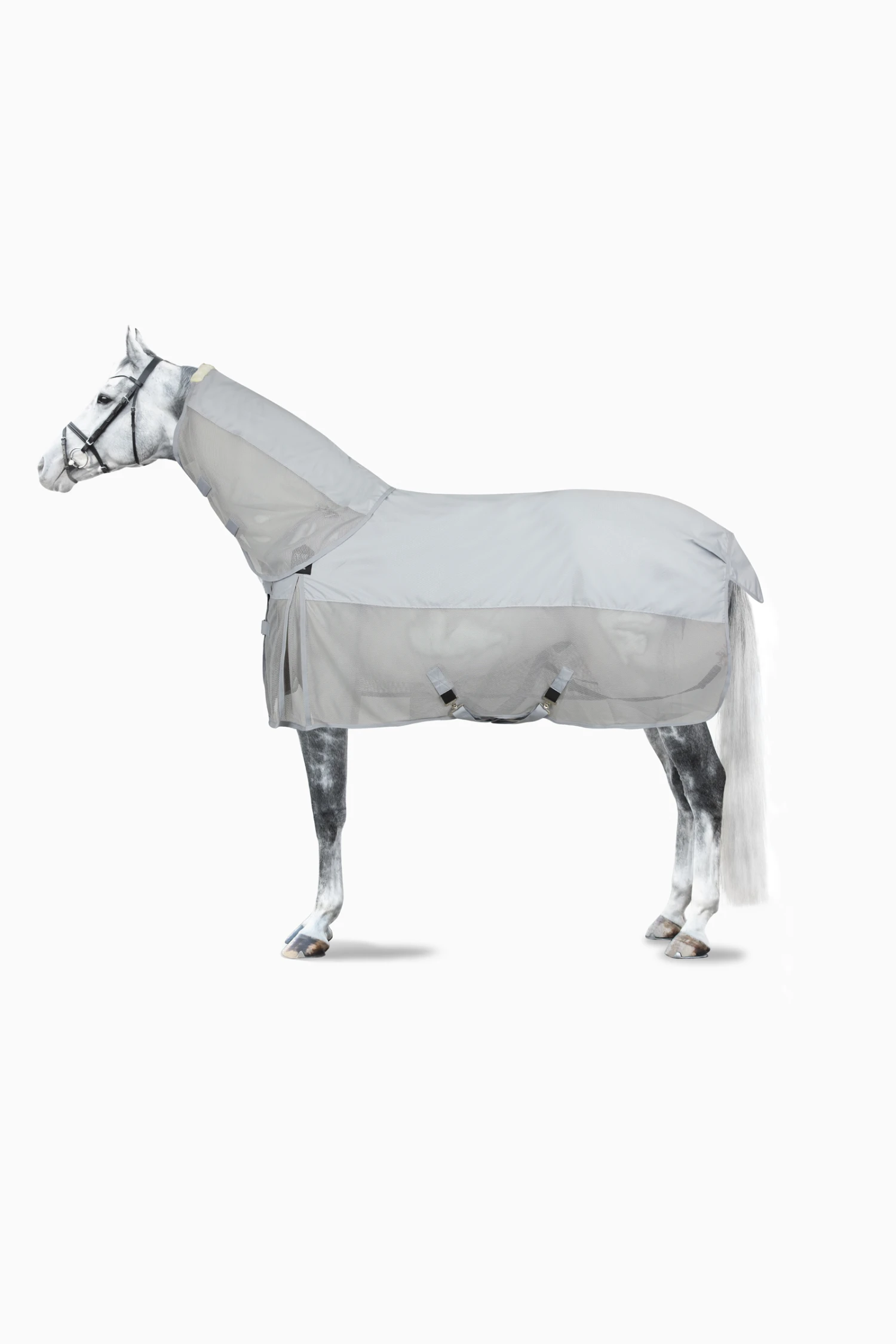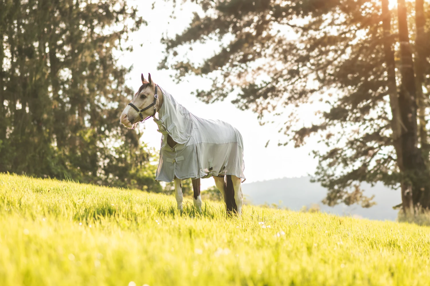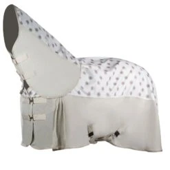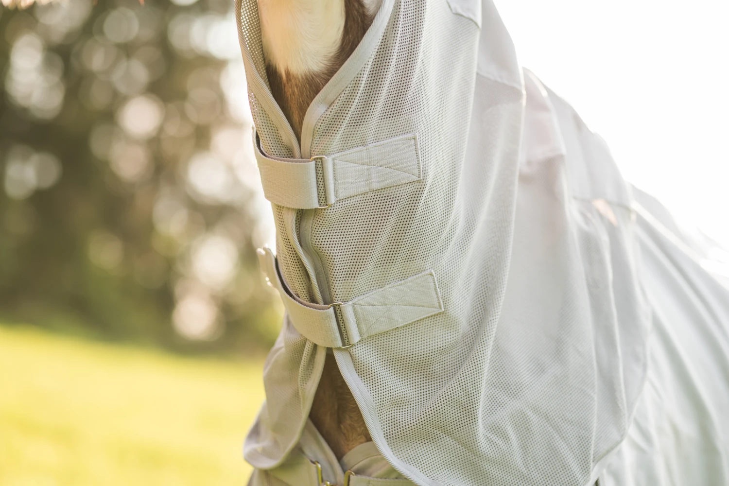 Die Horze Nevada Combo-Decke hat alles, was dein Pferd im Sommer braucht: Der obere, wasserdichte Teil schützt vor Regen und ist aus lichtreflektierendem Gewebe gefertigt. Das atmungsaktive Unterteil hält Fliegen fern. Weiches Kunstfell am Widerrist bietet Komfort. Das abnehmbare Halsteil bietet zusätzlichen Schutz und Atmungsaktivität und ist einfach zu befestigen. Hohe Gehfalten schränken die Bewegungsfreiheit deines Pferdes nicht ein. Der doppelte Frontverschluss, die Kreuzgurte und die Beinschlaufen halten die Decke an ihrem Platz.