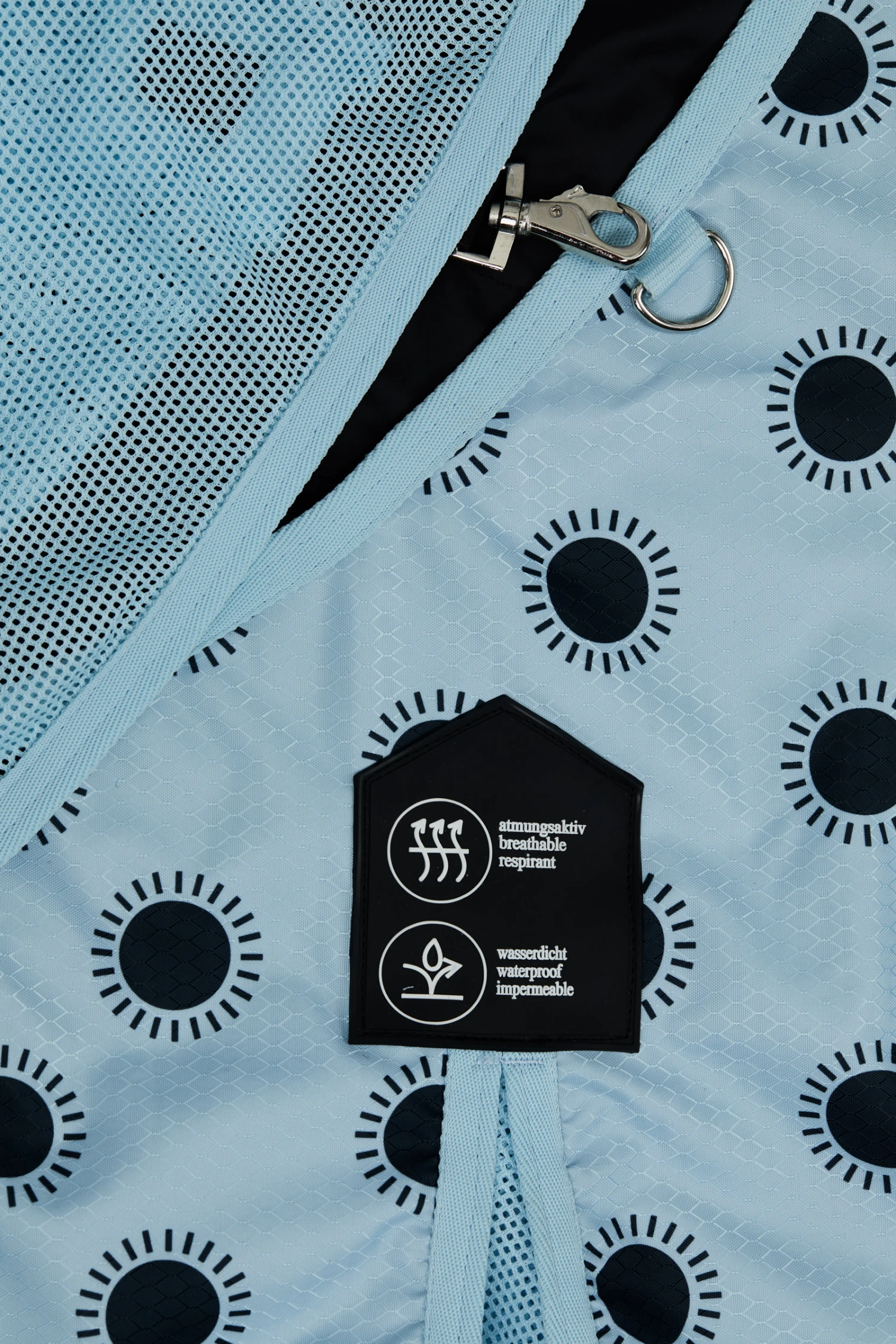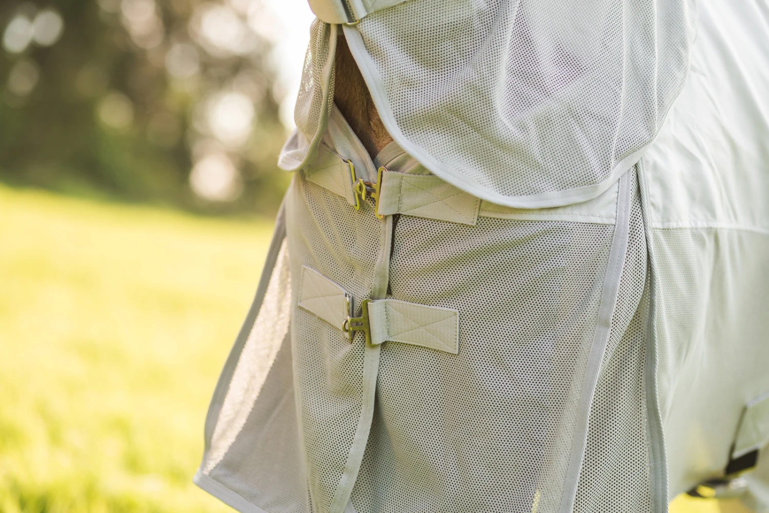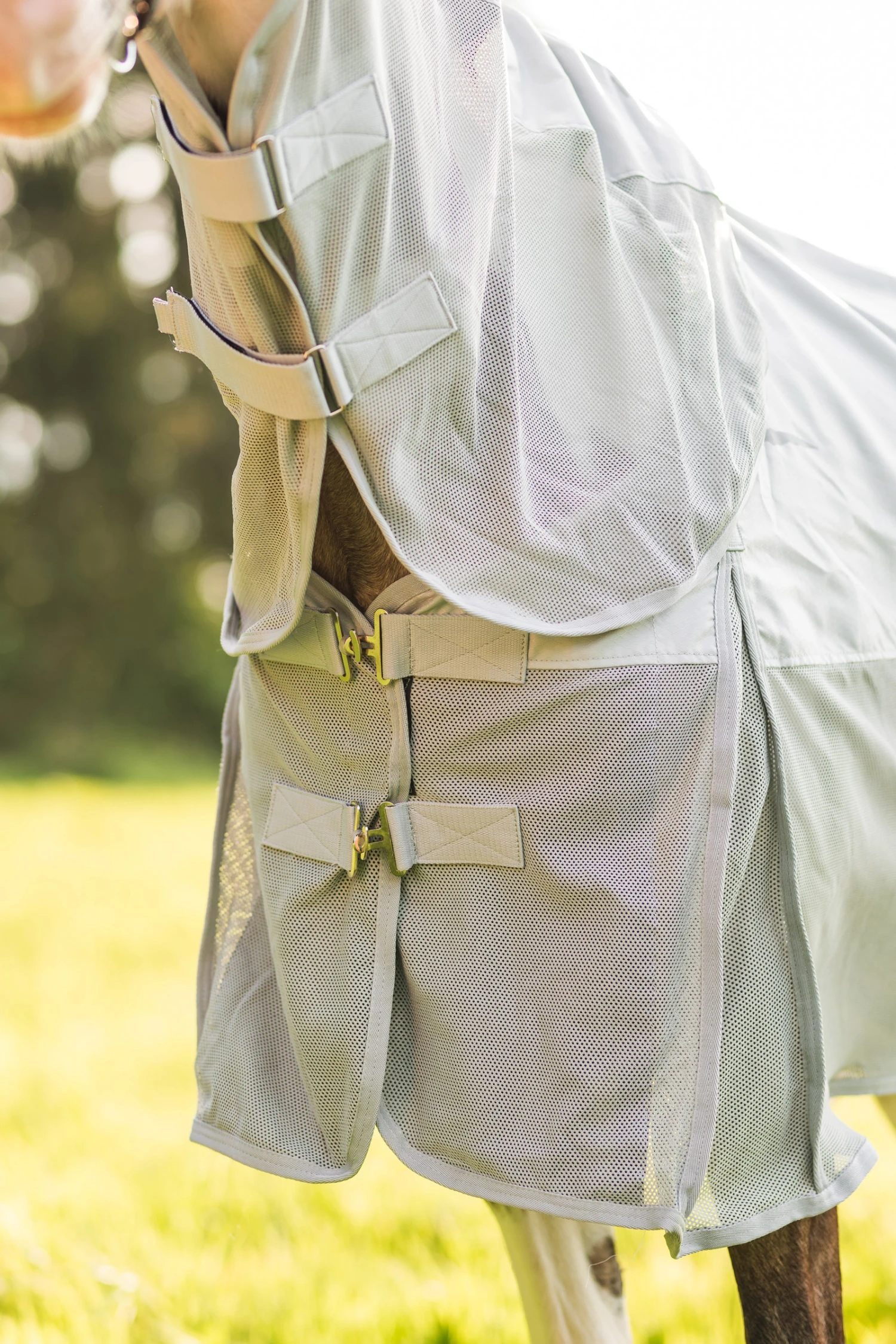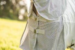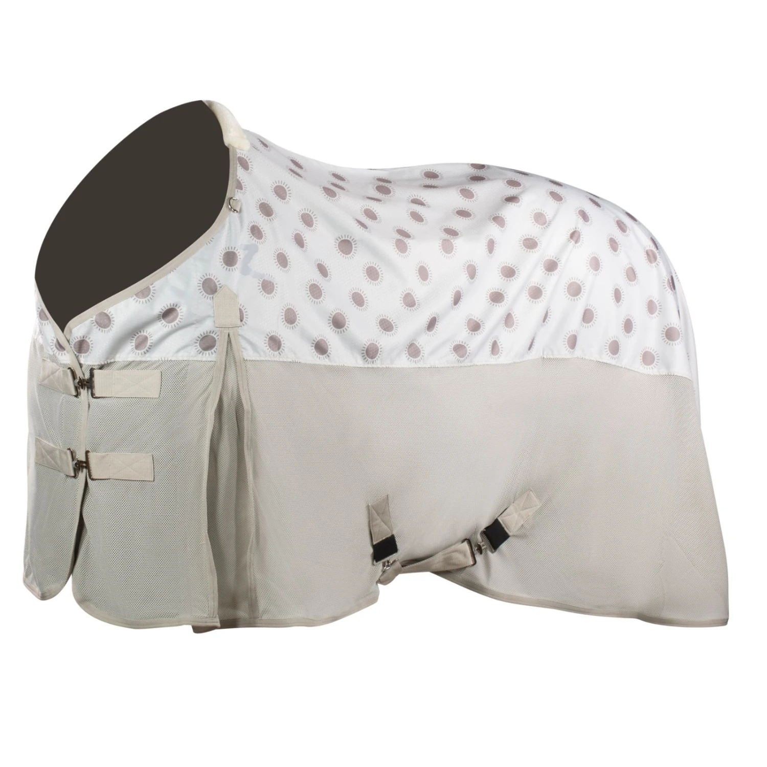 Die Horze Nevada Combo-Decke hat alles, was dein Pferd im Sommer braucht: Der obere, wasserdichte Teil schützt vor Regen und ist aus lichtreflektierendem Gewebe gefertigt. Das atmungsaktive Unterteil hält Fliegen fern. Weiches Kunstfell am Widerrist bietet Komfort. Das abnehmbare Halsteil bietet zusätzlichen Schutz und Atmungsaktivität und ist einfach zu befestigen. Hohe Gehfalten schränken die Bewegungsfreiheit deines Pferdes nicht ein. Der doppelte Frontverschluss, die Kreuzgurte und die Beinschlaufen halten die Decke an ihrem Platz.