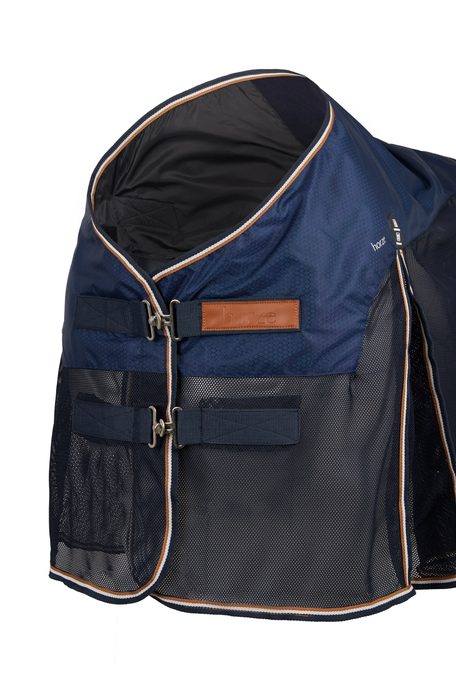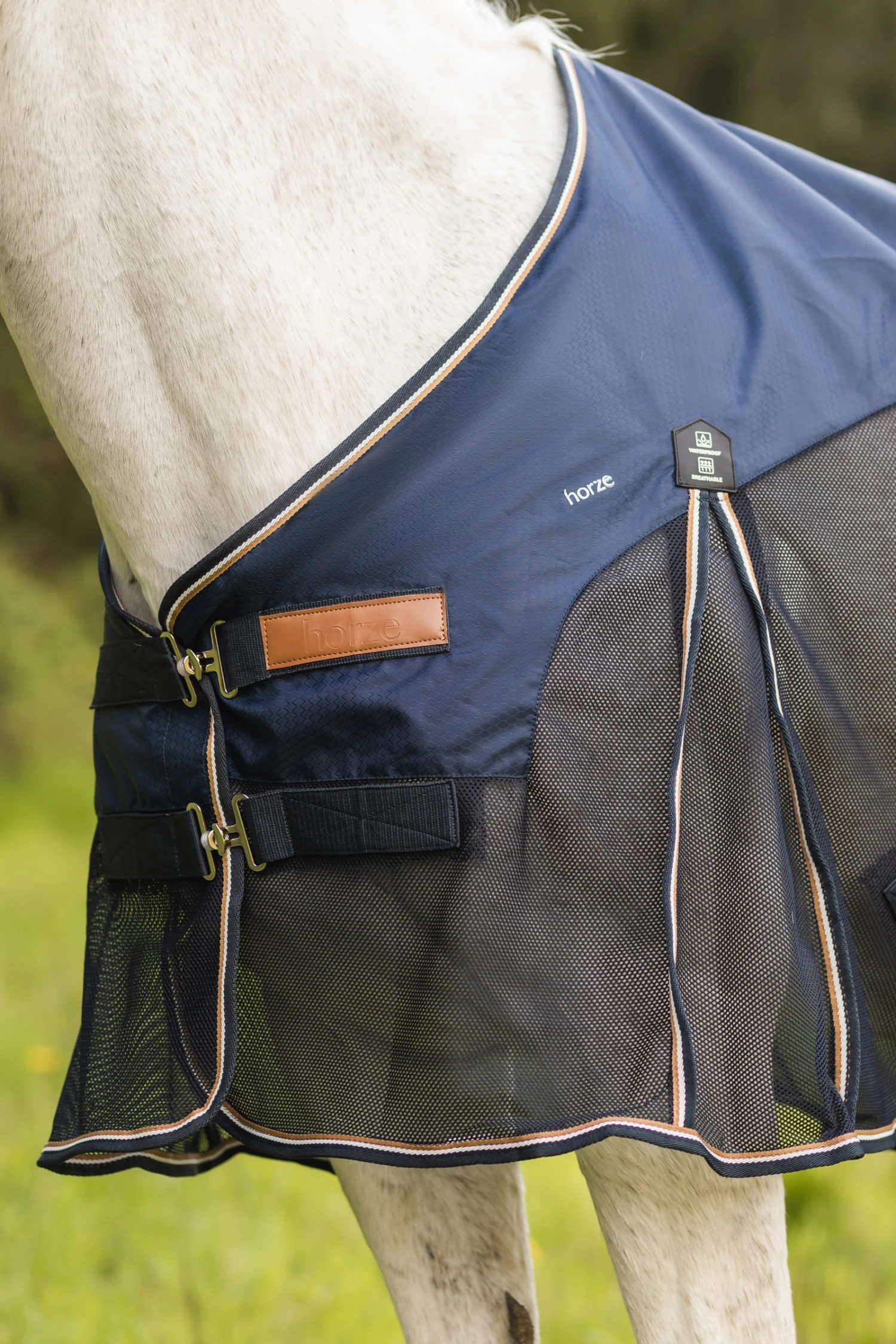 Die Horze Nevada Decke besteht oben aus wasserdichtem Material und ist an der Wirbelsäule, wo dein Pferd es am meisten braucht, mit warmem Echtwollfutter ausgestattet. Wolle vereint fantastische Funktionen, die diese Decke super funktional machen: Sie ist im Sommer kühl und im Winter warm, atmungsaktiv, feuchtigkeitsabsorbierend, antibakteriell und nachhaltig. Der weiche Stoff verhindert außerdem Reibung. Der untere Teil der Decke besteht aus atmungsaktivem Mesh, das bequem ist und für Belüftung sorgt. Frontschnallen, Kreuzgurte und Beinschnüre halten die Decke an ihrem Platz. Das raffinierte Design mit PU-Leder-Logoaufnähern verleiht deiner Reitausrüstung einen klassischen Touch.
