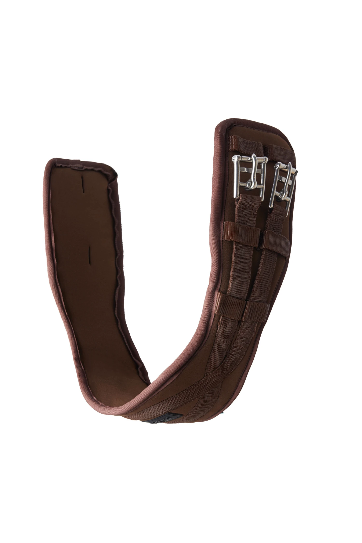 Weicher, geformter Neopren-Dressursattelgurt mit Elastik an einem Ende. Für mehr Komfort reicht das Neopren über die Rollschnallen hinaus, um Scheuerstellen zu vermeiden. Kreuzendes Nylonband für optimale Stabilität und Druckverteilung. Gurtschlaufen halten die Gurtstrupfen an ihrem Platz. Gummi-Logo-Abzeichen in der Mitte.