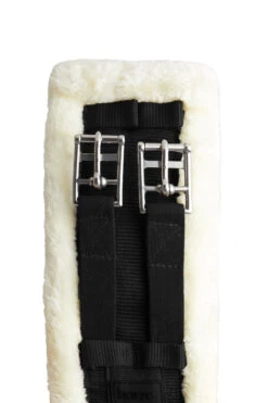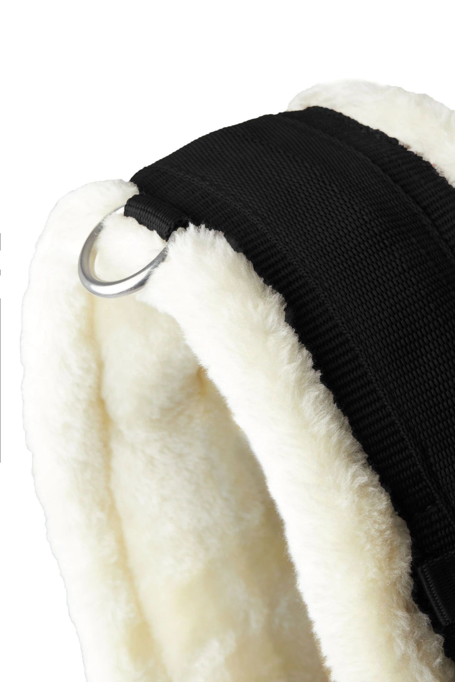 Mit Kunstfell gepolsterter Langgurt aus weichem Neopren mit Elastik an beiden Enden. Die doppellagigen Elastikeinsätze geben in der Bewegung weich nach und halten den Gurt dennoch an seinem Platz. Der Gurt hat Rollschnallen zum einfachen Gurten und einen D-Ring in der Mitte zum schnellen Befestigen von Hilfszügeln oder Vorderzeugen. Für mehr Stabilität ist entlang des äußeren Neoprens ein Gurtband eingenäht. Auch als Langgurt erhältlich (#14687). Logoabzeichen aus Gummi.