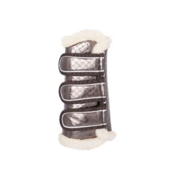 Sehr schicke Dressurgamaschen mit Kunstfell an der Oberseite und innen an der Unterseite. Aus geprägtem PU-Material und mit reflektierenden, silberfarbenen Paspeln. Mit Gummi-Logoetikett am oberen Verschluss.