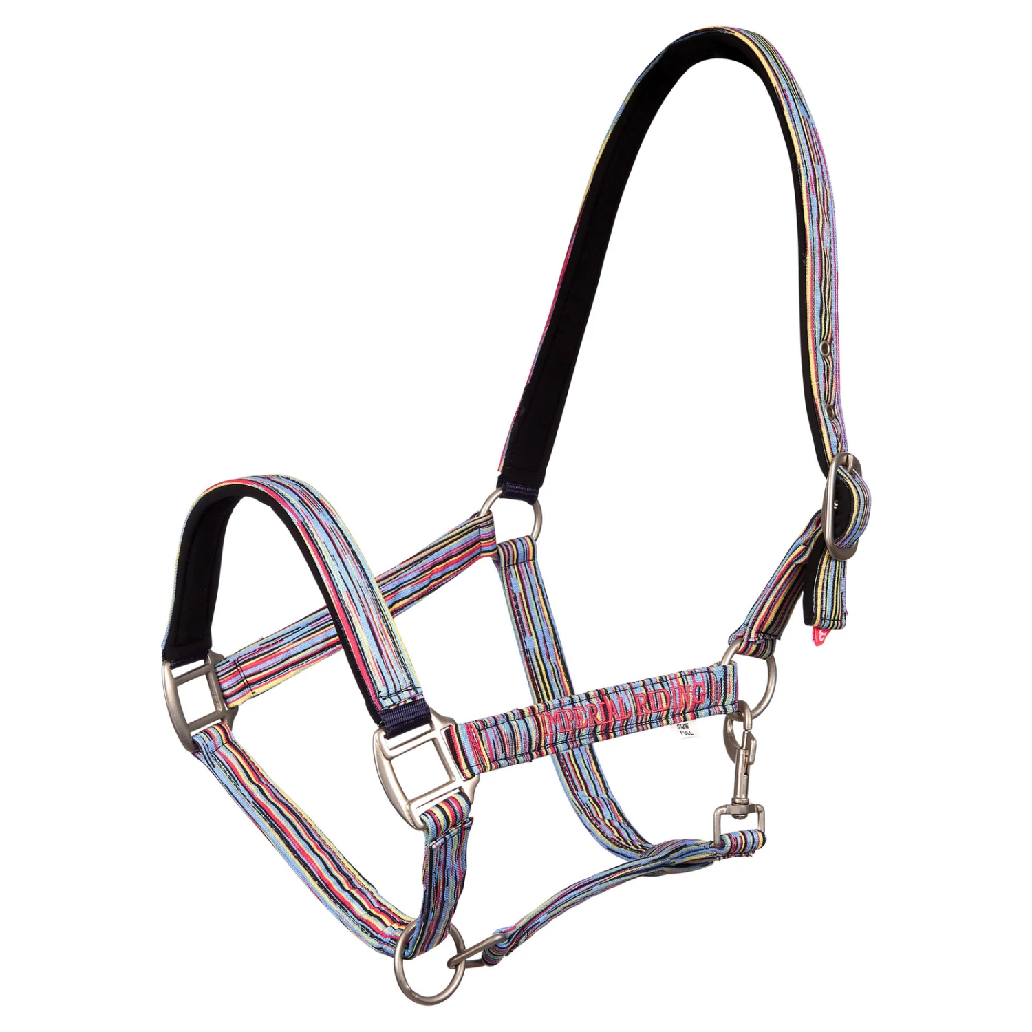 Dieses Halfter fällt durch seine knalligen Farben auf! Gummierte Grafik an den Backenstücken und rosa Metallverschluss. Ein echter Blickfang!