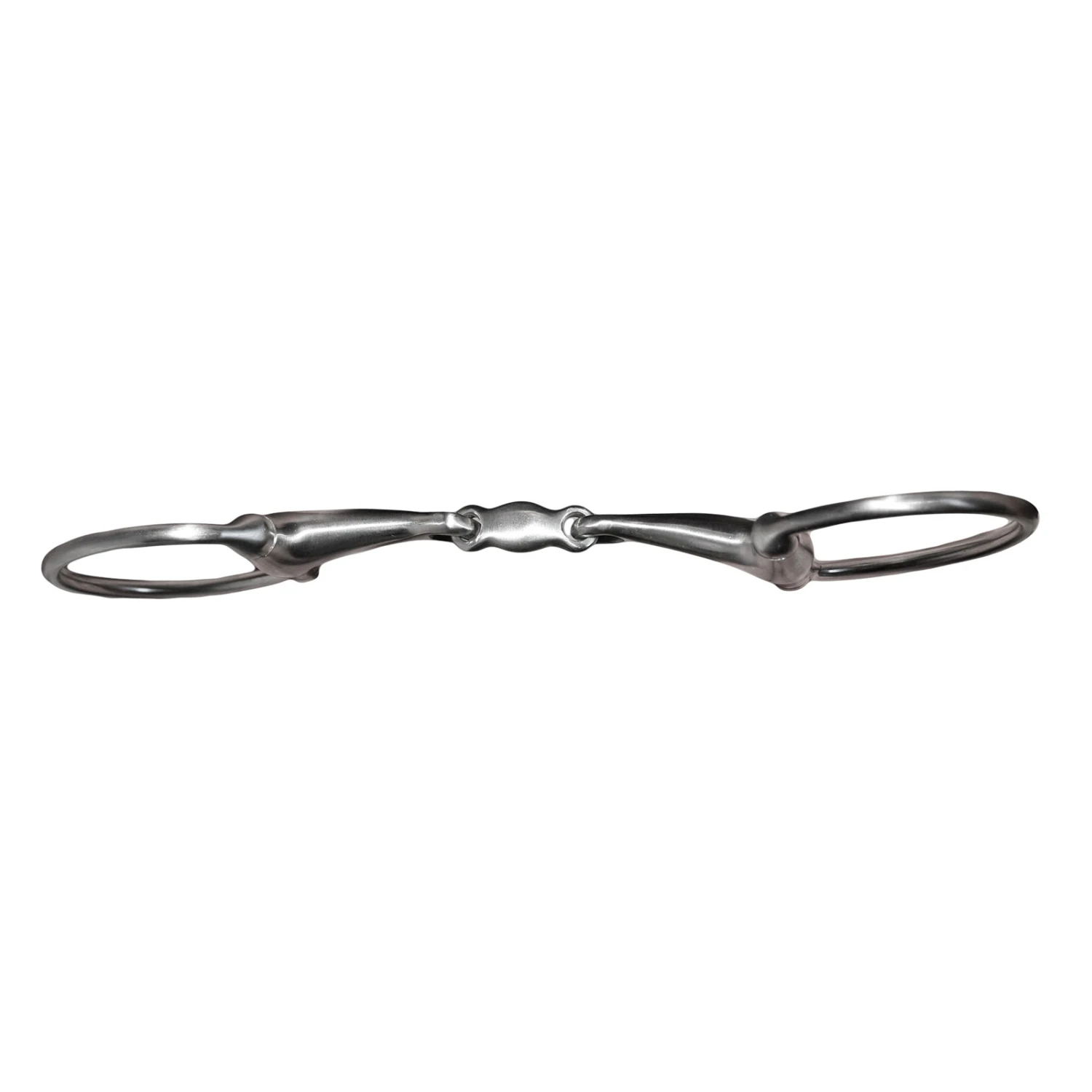 Effektives und ergonomisch geformtes, doppelt-gebrochenes Gebiss mit einer Kombination aus Olivenkopf und Kugel in der Mitte, für eine verbesserte Zungenfreiheit. Gebürsteter Edelstahl.
