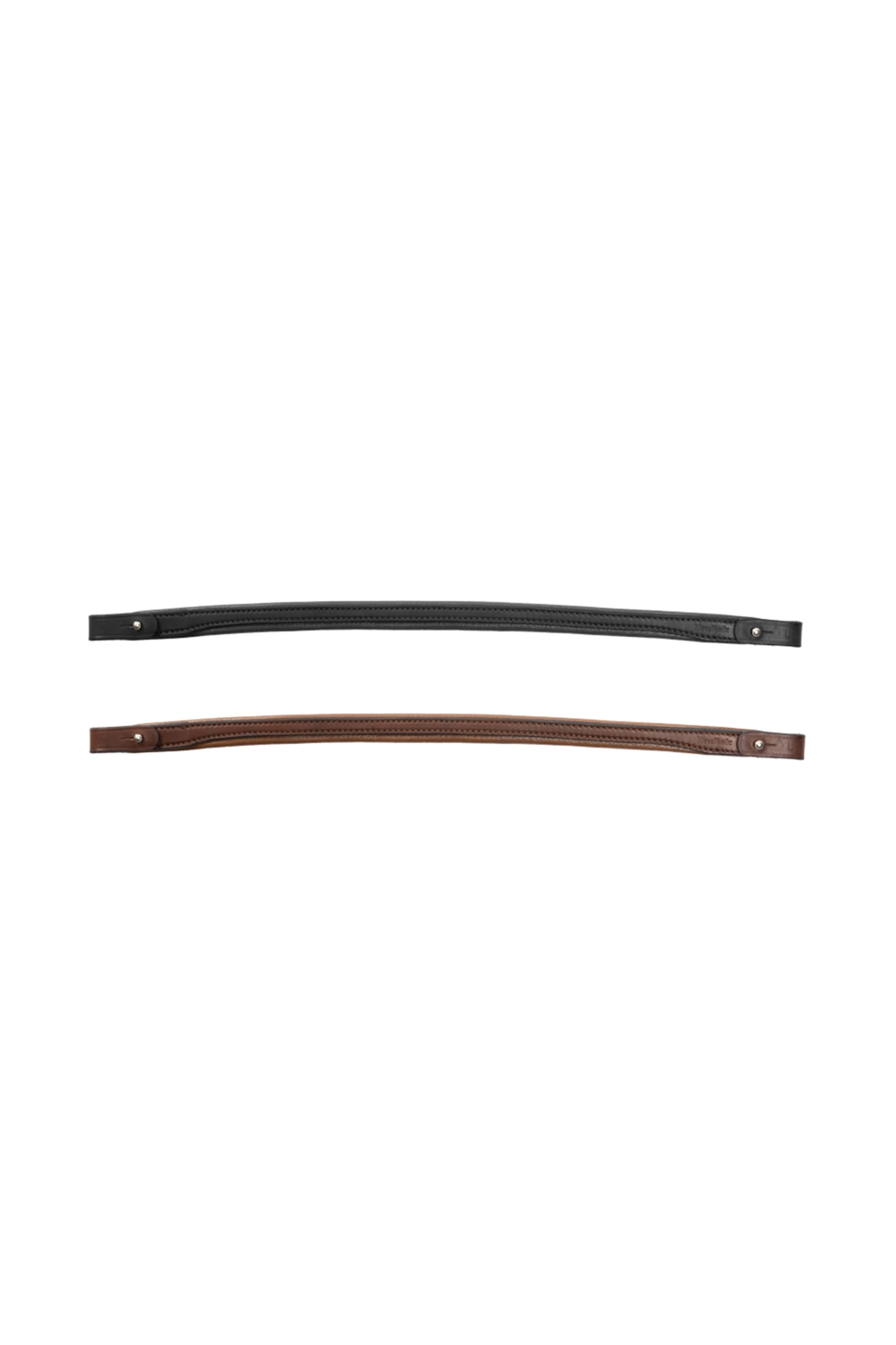 Weicher Stirnriemen aus geöltem Leder. Mittels Knopfverschluß kann das Stirnband einfach und schnell gewechselt werden, ohne die Trense auseinander zubauen.