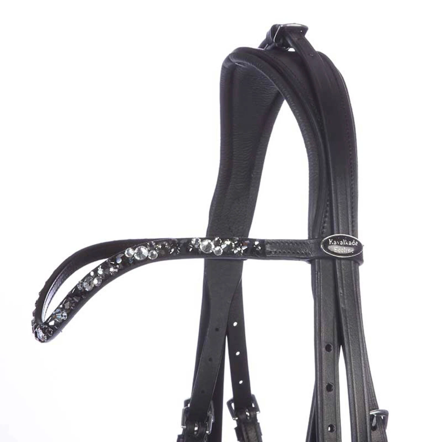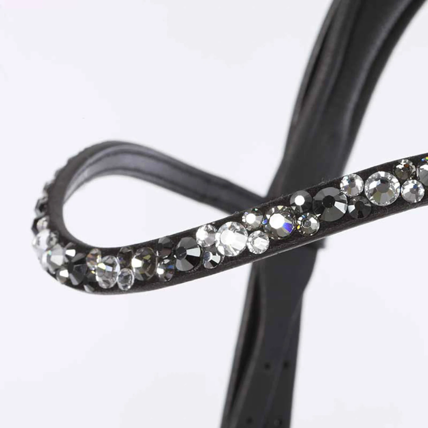 Eine extrem praktische Kombination aus Trense und Kandare. Mit elegantem Stirnband mit weiĂźen, grauen und schwarzen Steinen. Anatomisch geformtes englisches Reithalfter mit abnehmbarem Sperriemen. Ăśberlaufende abnehmbare BackenstĂĽcke zum Umwandeln in eine Kandare. Die Kombi Kandare wird darĂĽber hinaus mit zwei ZĂĽgelpaaren vergeben. Zum einen ein normaler Kandaren LederĂĽgel ohne Stege und zum anderen ein gummierter schmaler ZĂĽgel.