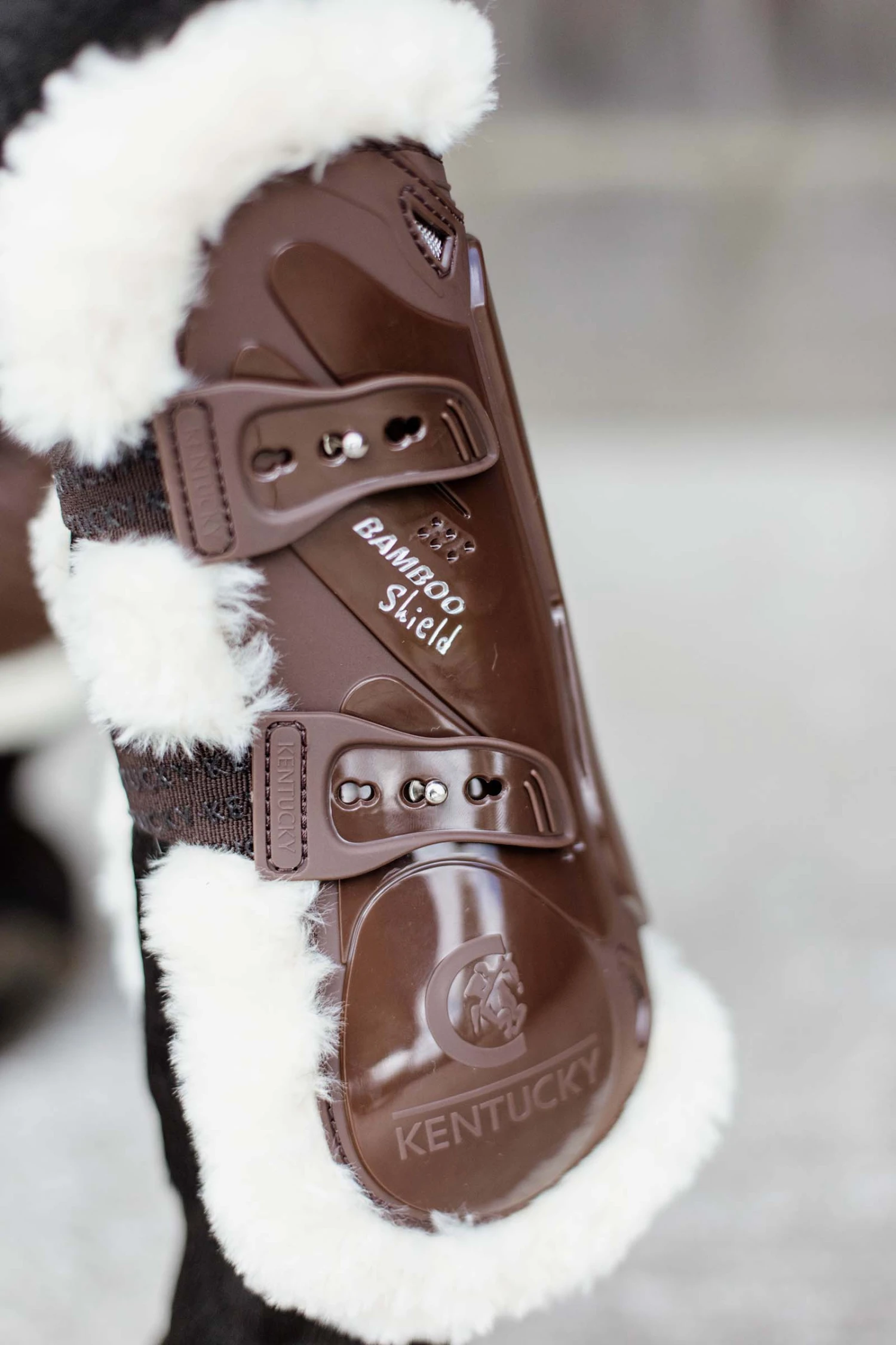 Die veganen Lammfell-Gamaschen Bamboo Elastic werden aus Kentuckys hoch atmungsaktiven veganen Lammfell hergestellt, das seit vielen Jahren für die berühmten Transporthalfter, die Turnierdecke und Sattelgurte verwendet wird. Die robuste Außenhülle besteht aus leichter und dennoch starker TPU-Schale, mit einem zusätzlichen Bambus-Einsatz im Sehnenbereich für optimalen Schutz vor jeglichen Stößen und dem Eindringen spitzer Gegenstände und ist zudem antibakteriell.
