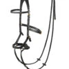 Der Nasenriemen wird tiefer auf der Nase des Pferdes getragen als andere Zäume und sitzt unterhalb des Gebisses. Dadurch bleibt das Maul des Pferdes geschlossen, was diese Zäumung ideal für junge Pferde macht, die gerade lernen, das Gebiss zu akzeptieren.
