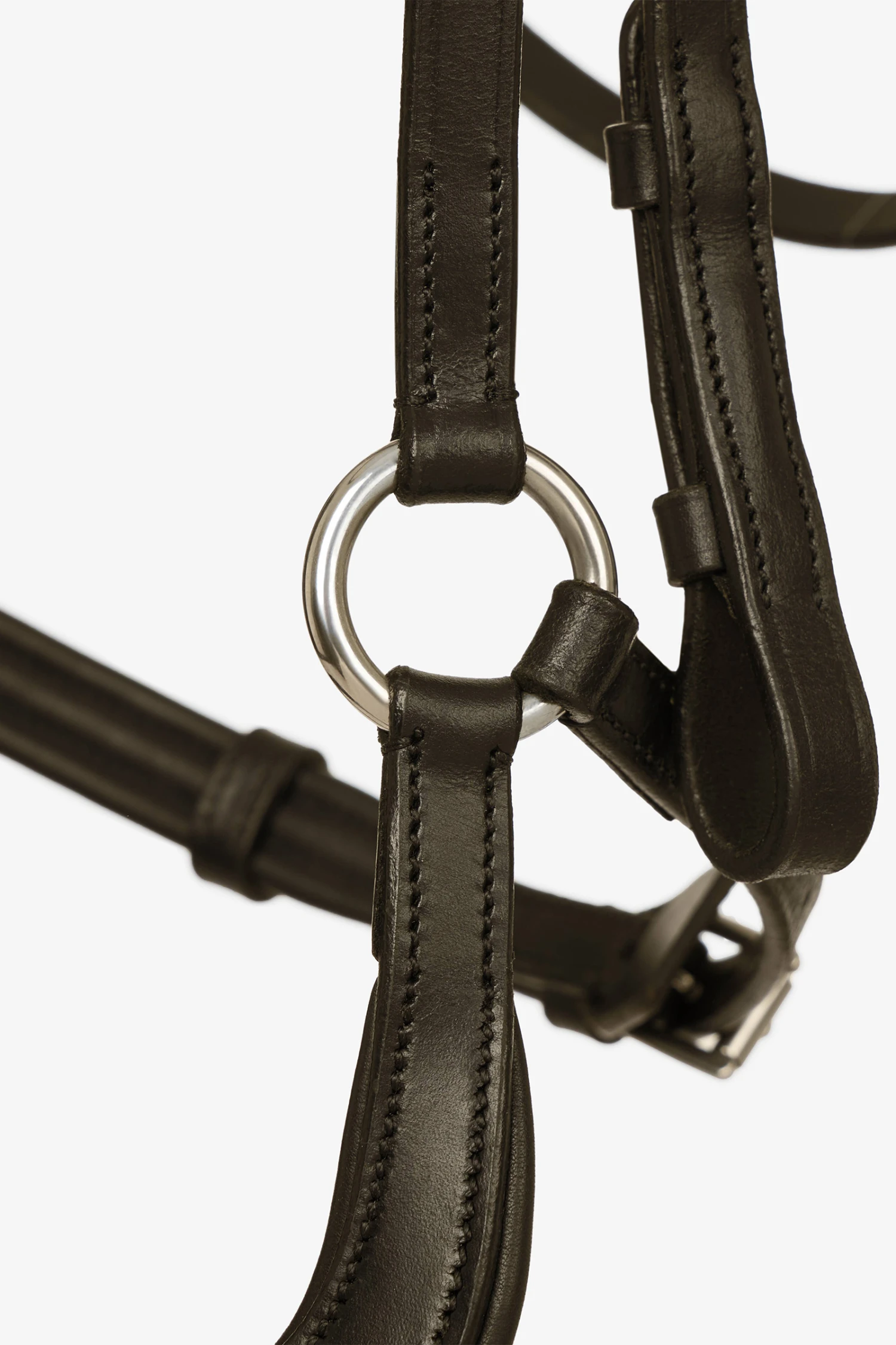 Dieser Zaum verfĂĽgt ĂĽber einen anatomisch geformten Stirnriemen, ein anatomisch geformtes, unterlegtes KopfstĂĽck und einen anatomisch geformten Nasenriemen, der so geschnitten ist, dass er keinen Druck auf empfindliche Stellen ausĂĽbt. Der D-Ring verbindet den Nasenriemen und die BackenstĂĽcke, damit sie gut am Pferd anliegen.