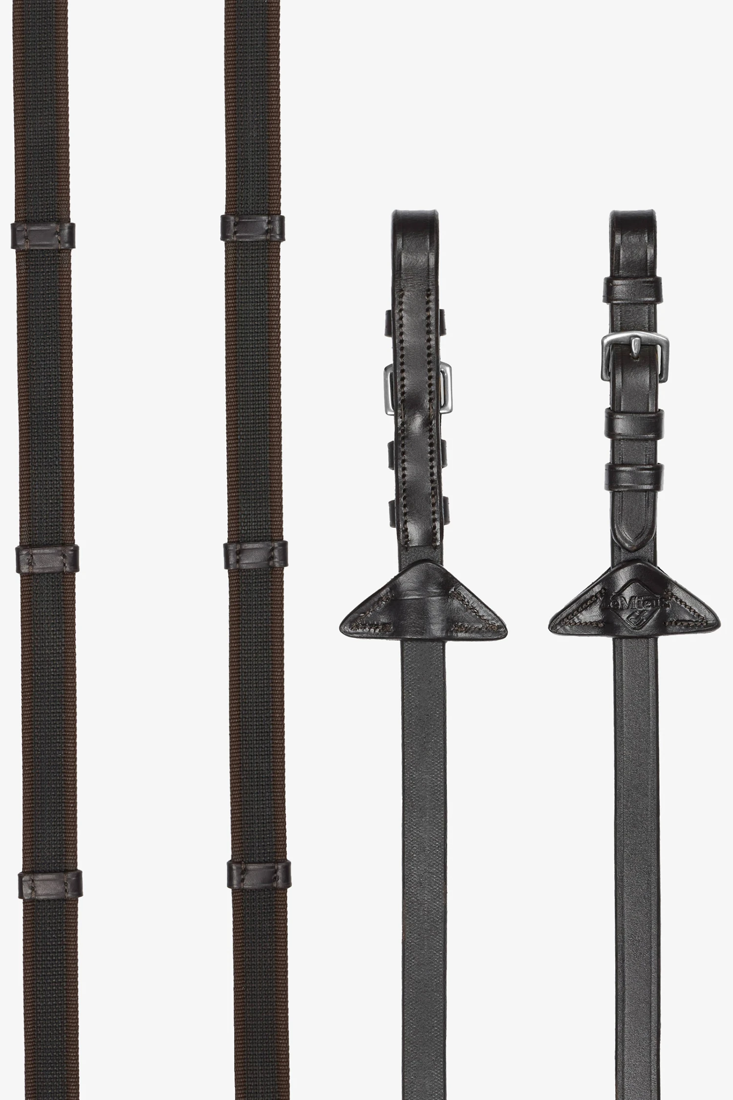 Die Zügel im klassischen schwarzen Design mit silberner Schnalle werden durch die passenden LeMieux Gummimartingalstopper ergänzt.