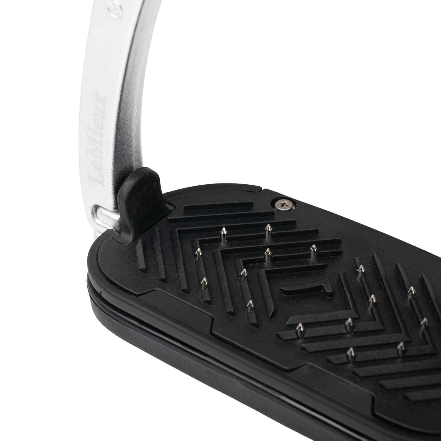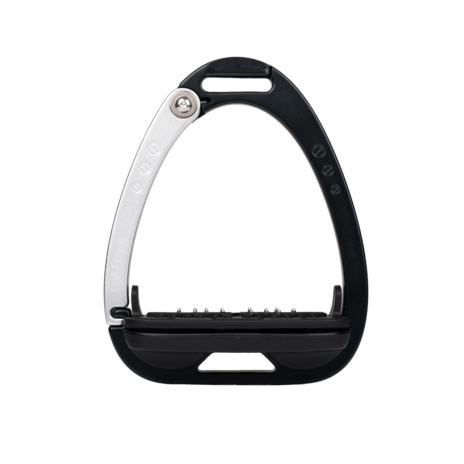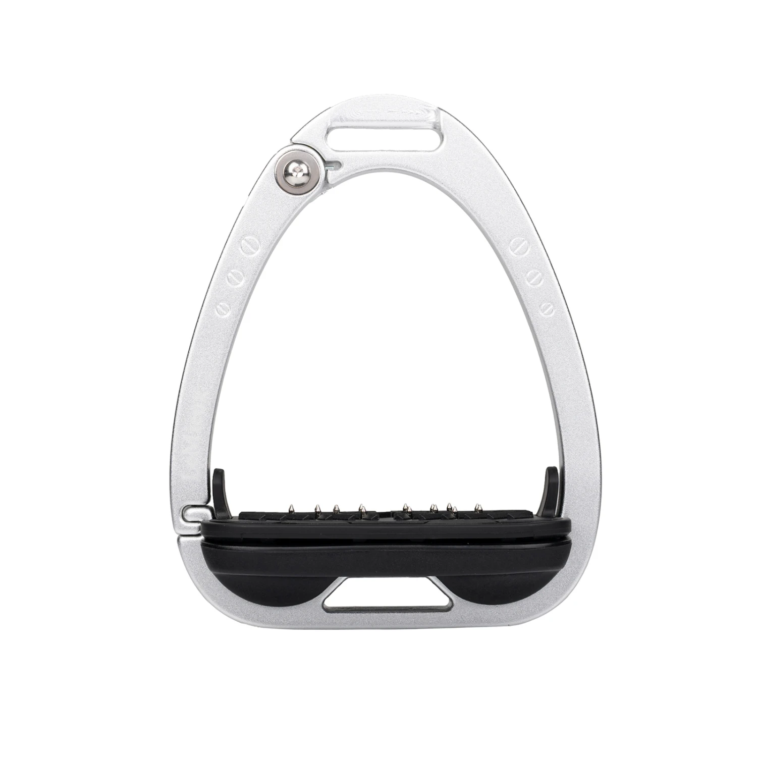 Die Trittfläche wird durch ein Twin-Balance-Bogensystem gestützt, das das Gewicht gleichmäßig auf die Basis des Steigbügelrahmens verteilt. Der Scheitelpunkt des Rahmens ist vertieft und versetzt, was eine 45º-Ausrichtung nach außen begünstigt, was es dem Reiter erleichtert, den optimalen Winkel für den Fuß zu finden und einen verlorenen Steigbügel wiederzufinden.