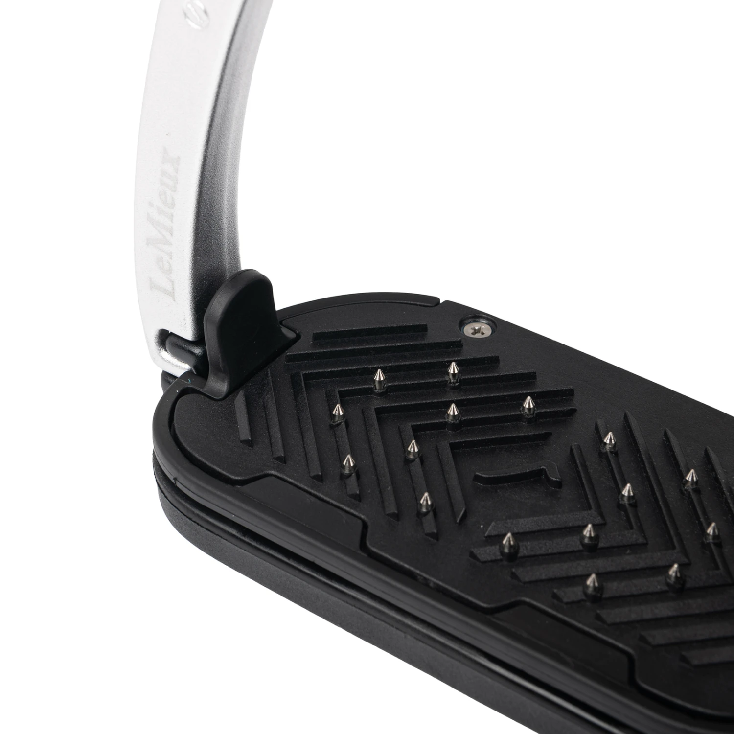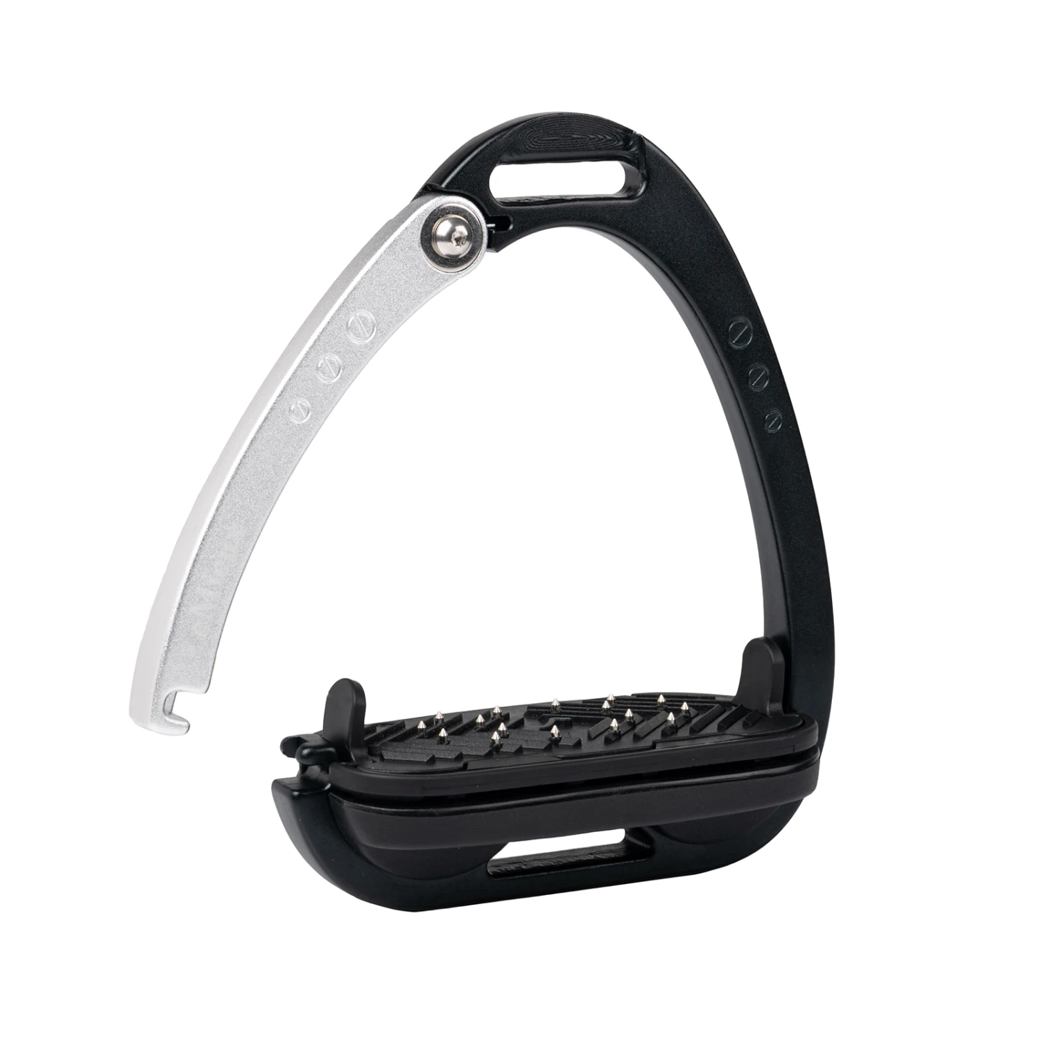 Ein integrierter Sicherheitsarm verfügt über ein zweistufiges Auslösesystem, das ein ungewolltes Öffnen verhindert. Der federbelastete Sicherheitsarm rastet in der Basis des Hauptrahmens ein, was bedeutet, dass bei hoher Belastung wie beispielsweise der Landung nach einem Sprung, das Gewicht des Reiters gleichmäßig auf den Steigbügel verteilt wird. Wenn Druck auf den Steigbügelarm ausgeübt wird, wie z. B. bei einem Sturz, löst sich der Arm, so dass der Fuß nicht im Steigbügel hängen bleibt. Die Auslösekraft des Steigbügelarms beträgt im Test 36N (entspricht 3,62kg), d.h. genug Widerstand, um ein unbeabsichtigtes Öffnen zu verhindern, aber ein sicheres Auslösen im Falle eines Sturzes des Reiters zu gewährleisten.