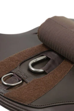 Mehr Bewegungsfreiheit dank optimaler Druckverteilung: Die innovative „Comfort Zone“ bei dem Stollenschutzgurt Oklahoma von Schockemöhle Sports setzt dafür neue Maßstäbe. Anatomisch geformt, ist der Sattelgurt im Bereich der Ellenbogen besonders flach gearbeitet. Gleichzeitig sorgt im Bereich des Brustkorbs die breitere Mittelplatte mit mehrlagigem Weichschaum für eine noch bessere Druckverteilung. Sie besteht aus festerem Leder und schützt damit auch vor Schlägen. Der große Karabiner erleichtert dem Reiter das Einschnallen des Vorderzeugs. Einmal befestigt, verhindert die Abdeckung mit der großen Lederklappe das gefährliche Hereintreten des Pferdes in beispielsweise ein Vorderzeug. Das beidseitige dreilagige Elastik sowie die weich gepolsterten Rollenschnallen heben den Komfort für das Pferd zusätzlich auf ein neues Level.