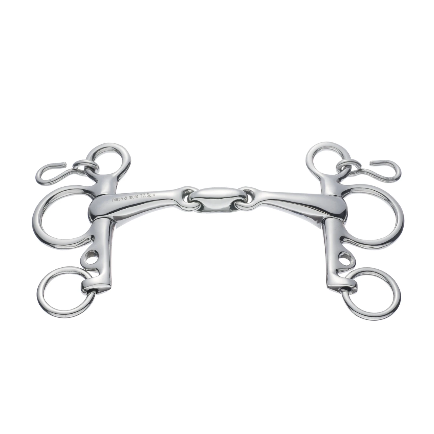 Das MAX-Control ist ein doppelt gebrochenes Gebiss, welches auf den ersten Blick nicht von anderen doppelt gebrochenen Gebissen zu unterscheiden ist.Es ist jedoch ein Korrektur- oder Ausbildungsgebiss, das zu einer geraden Stange wird, wenn es in einem bestimmten Winkel steht.Das Gebiss liegt sehr gut im Maul wenn das Pferd nicht gegen die Zügelhilfen des Reiters ankämpft. Wenn das Pferd sich gegen die Zügelhilfen des Reiters wendet, wirkt das Gebiss stärker ein.Das Pelham ist ein Gebiss, welches etwas mehr Hebelwirkung über das Genick ausübt. Der Druck auf den Unterkiefer wird über eine Kinnkette ausgeübt. Im weitesten Sinne ist ein Pelham eine Kombination von Kandare und Wassertrense. Pelhams können mit ein oder zwei Zügeln verwendet werden, was auch Möglichkeiten für verschiedene Verschnallungen der Zügel gibt. Direkter Druck wird auf die Zunge und die Laden des Pferdes ausgeübt, wenn der Reiter nur die Trensenzügel verwendet.