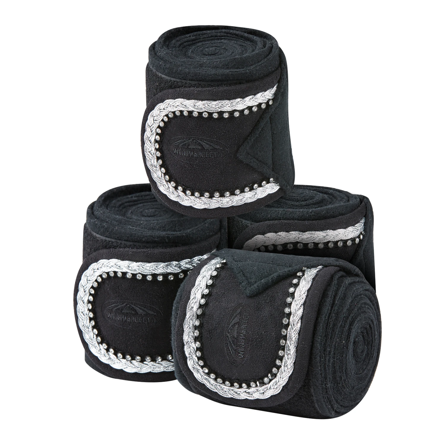 Die WeatherBeeta Prime Bling Fleecebandagen mit Strasssteinen und Kordeleinfassung für mehr Stil. 4er Set Banadagen, perfekt die Beine Ihres Pferdes vor Stößen beim Training zu schützen, hergestellt aus weichem, hochwertigem Anti-Pilling-Fleece, mit einzelnem Klettverschluss. Komplett mit einer wiederverwertbaren Tragetasche. Farbliche passende Schabracke und Ohrenhaube erhältlich.
