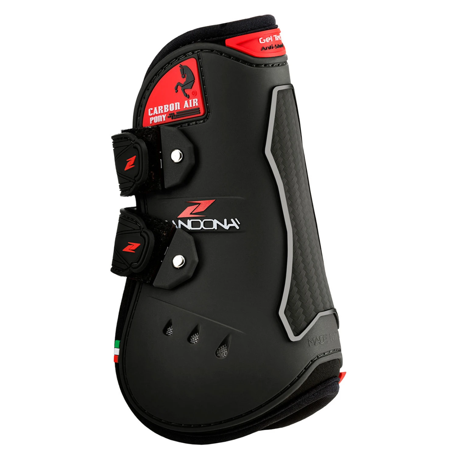 Das zu 100 % in Italien hergestellte Schutzsystem „CARBON AIR PONY Tendon“ wurde entwickelt, um Springponys vor Aufprall und Hämatomen an den vorderen Fesseln und einem Teil des Schienbeins zu schützen und gleichzeitig Halt für die Sehnen zu bieten. Es besteht aus einer äußeren TPU-Struktur mit differenzierter Dicke, atmungsaktiv dank des perforierten Neoprens und belüftet mit 6 Lüftungsöffnungen über der Fessel. Zwischen der äußeren TPU-Struktur und dem Neoprenschutz befindet sich Gel-Tech, das, wenn nötig, als Stoßdämpfer und ansonsten als bequemes Polster dient. Kohlenstofffaser Elemente sind unter der Schale thermisch zu isolieren die Gelenke von der Wärme, die durch äußere Reibung erzeugt, bei gleichzeitiger Erhöhung der mechanischen Festigkeit gegen Stöße. Aufder Innenseite, zum langen Fesselknochen hin geschlossen, wurde eine Flex-Zone geschaffen, die nötig ist, um dem Bein maximale Bewegungsfreiheit zu geben. Das Verschluss wird durch Velcro-Riemen garantiert, der Riemen ist abtrennbar und darf, wenn abgenutzt, einfach ersetzt werden. Die Maße und die absolut ergonomische Form wurden als genaue Kopie der Beinstruktur entwickelt, was eine perfekte Positionierung garantiert und jegliche Spannung vermeidet.